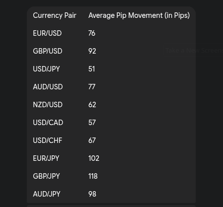 The table below shows the average daily pip movement for major currency pairs specifically during the Tokyo session. This data is invaluable for planning your trades.