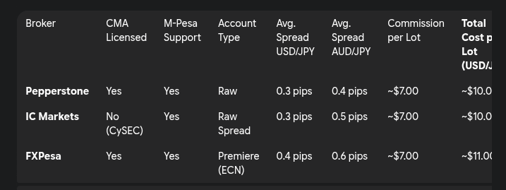 - Pepperstone: In my view, Pepperstone is a top-tier choice for serious Kenyan traders. They are regulated by the CMA (Licence No. 128), offer M-Pesa funding, and provide both Standard and Raw accounts on MT4, MT5, and cTrader. Their Raw account is particularly compelling for Tokyo session trading, with average spreads on USD/JPY around 0.3 pips and AUD/USD around 0.1 pips, plus a competitive commission.